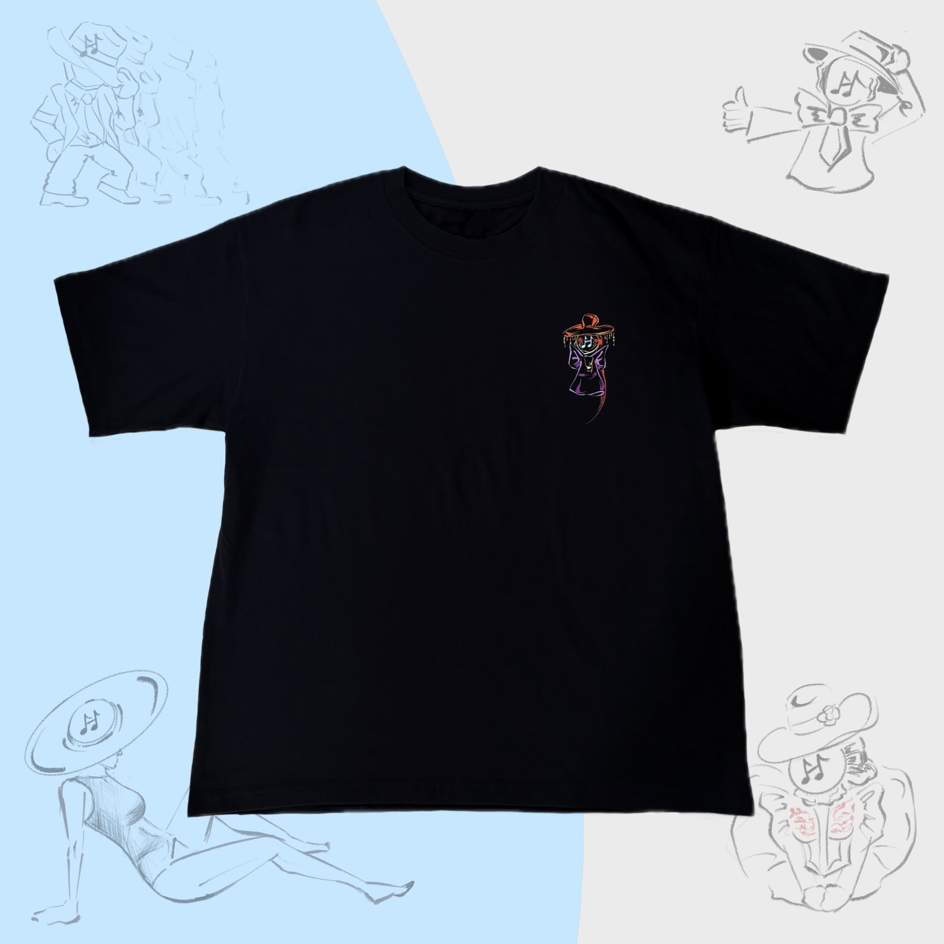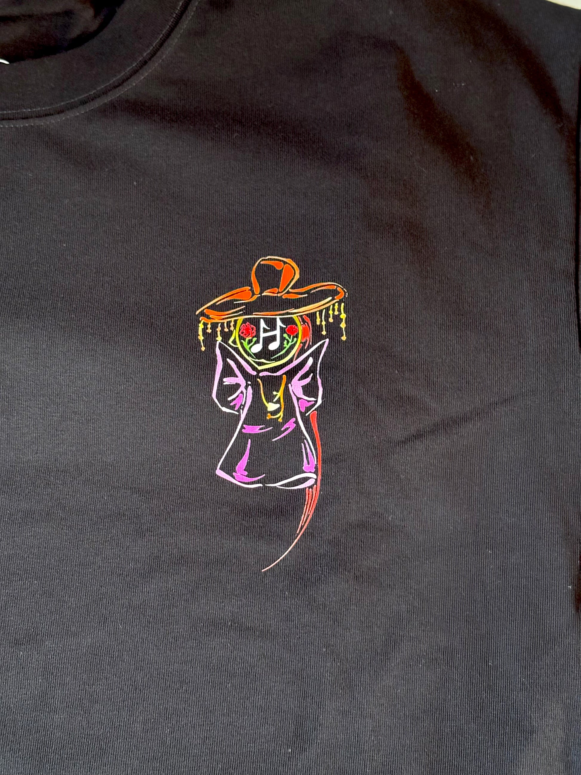 Meet Lady Stardust—the mystical muse of Hoppy who reminds us all to Embrace Hope. Draped in flowing lines and crowned with a whimsical hat, this fierce and dreamy character shines with quiet power. The back features her full aura framed in neon strokes, while the front keeps it subtle with a small chest print—like a secret symbol for those in the know.